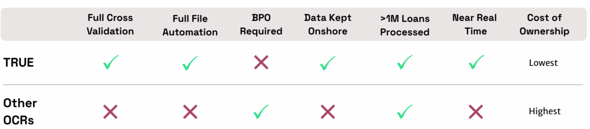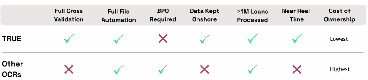 OCR captures text but misses meaning, leaving teams to review, correct, and re-enter key details. TRUE extracts clean, structured data in real time — no templates or human review — ready to flow directly into your LOS.
